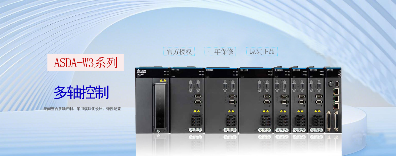 ASDA-W3 系列是一款多軸控制型高階伺服產品。模塊化設計可彈性配置,有效降低空間與建置門坎。ASDA-W3在特別設計的背板模塊插入模塊以增加驅動軸數,擁有高速同步運動性能,可搭配上位機完成直線、圓弧、螺旋等補間或多組龍門等多軸同步運動,實現優異的追隨效果。此外,共享資源的設計也使ASDA-W3能夠優化安裝空間,在軸數越多的情況下節省的空間越大。在節能方面,ASDA-W3內建共直流母線搭配儲能模塊,能回收并運用回升能量,大幅提升能源使用效率。   主要特點:   ● 緊湊尺寸,一站多軸:模塊化設計,整合不同功能模塊,彈性配置系統組合;單一驅動模塊實現,雙電機控制;模塊之間不須散熱空間;電控安裝空間節省最高達 35%。   ● 高同步更新率:使用背板模塊,可實現 400 Mbps 高速通訊;控制模塊最大控制12 軸;最高響應帶寬 3.5 kHz;使用EtherCAT通訊,最快通訊速度達 125 µs,可支持多種臺達伺服、線性、直驅電機。   ● 簡易配置,安裝方便:產品采用背板式安裝方式,可獨立更換模塊,節省人力及安裝時間;前方出線,更便于維修和維護。   ● 內建多種運動控制方式:擁有強大的龍門功能,可實現多組龍門運動并提升追隨效率;亦可整合臺達 Load Cell 進行高速閉環壓合控制。   ● 安全及保護:控制模塊與驅動模塊均具備STO SIL3,此外還有電源偵測保護功能。   ● 高能源效率:共直流母線結合儲能模塊,大幅提升回生能量使用效率;當電壓過高時,回饋能量儲存,電壓過